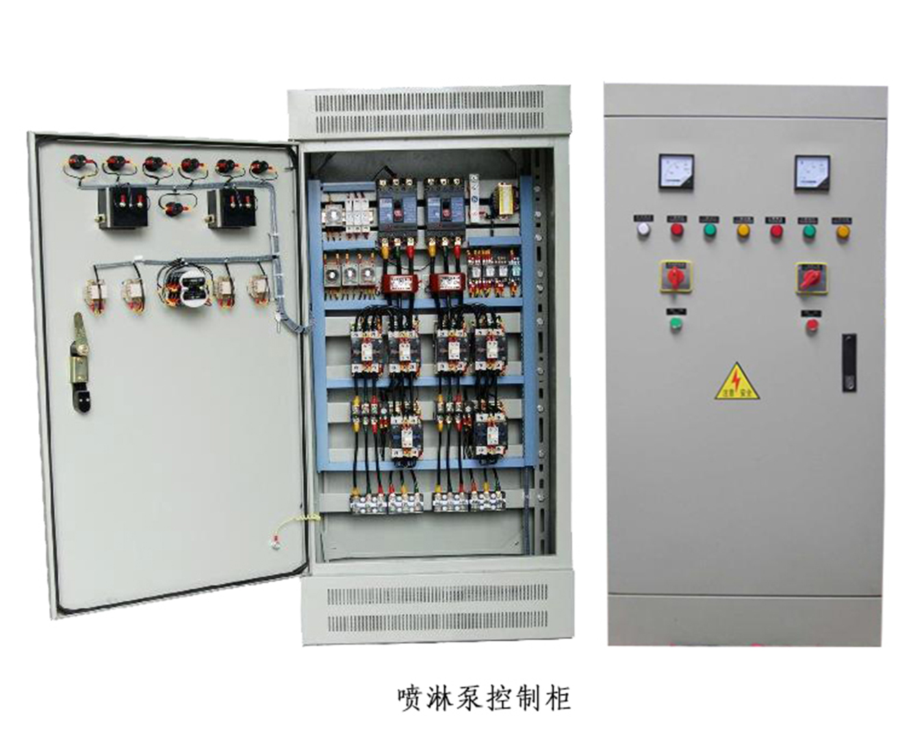 消防水泵控制柜一般有兩種控制方式:一種是消火栓控制,一種是噴淋泵控制。 噴淋泵控制柜的工作原理是:設(shè)計有壓力控制器常開觸點,當由于壓力差引起壓力繼電器動作時,控制回路使得主回路動作,然后啟動噴淋泵。